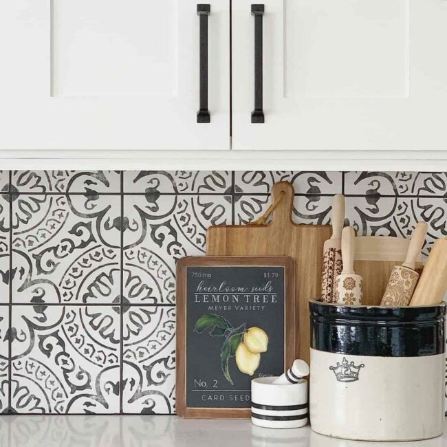 Kitchen designs burst with personality when white-and-gray tile backsplashes create dramatic visual interest against smooth light countertops.