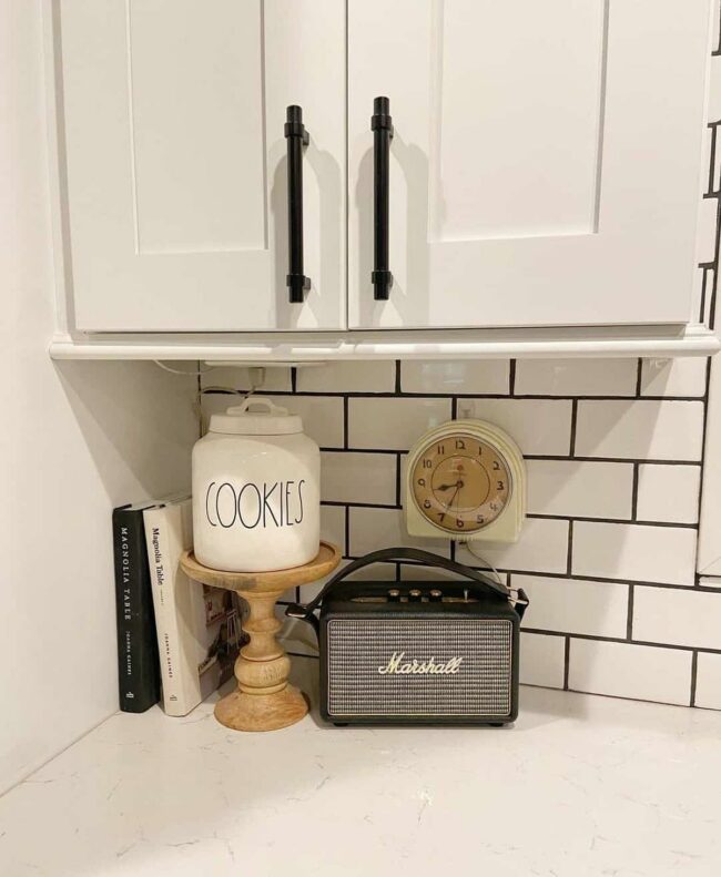 Wooden accents bring character to the space, especially the charming ceramic cookie jar perched on a rustic stand.