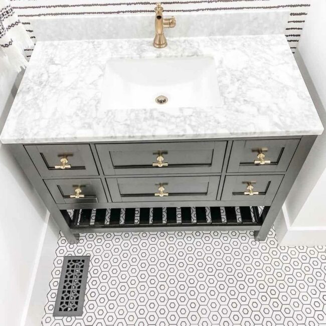 Gunmetal sink faucets add bold metallic punctuation to the sophisticated palette.