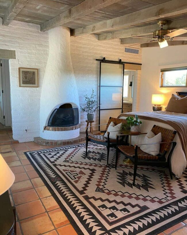 Earthy tones and geometric patterns work together, creating a calming atmosphere.
