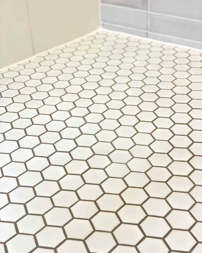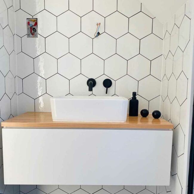 Hexagon white tiles dominate this bathroom nook, creating a mesmerizing backdrop that feels modern and chic.