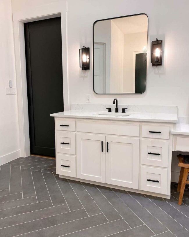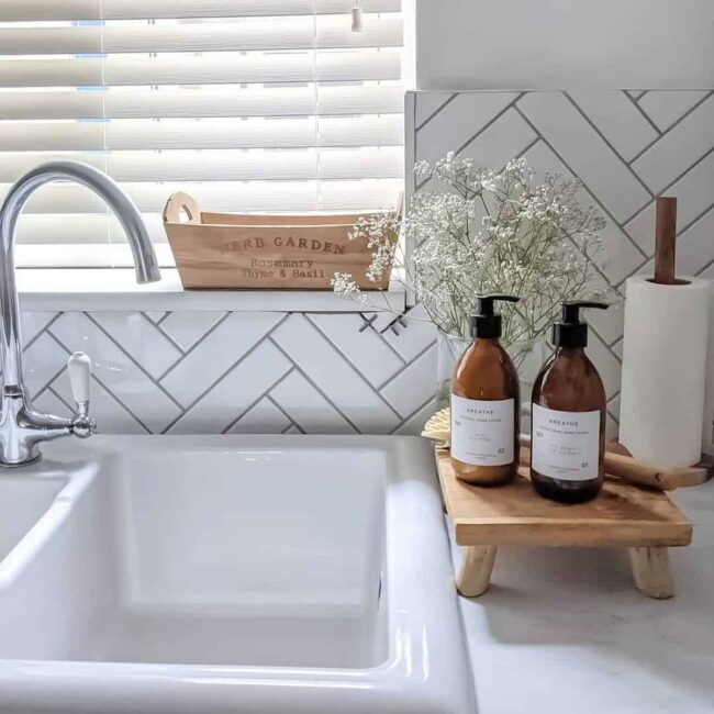 Herringbone patterns elevate the space with elegant lines and visual interest.