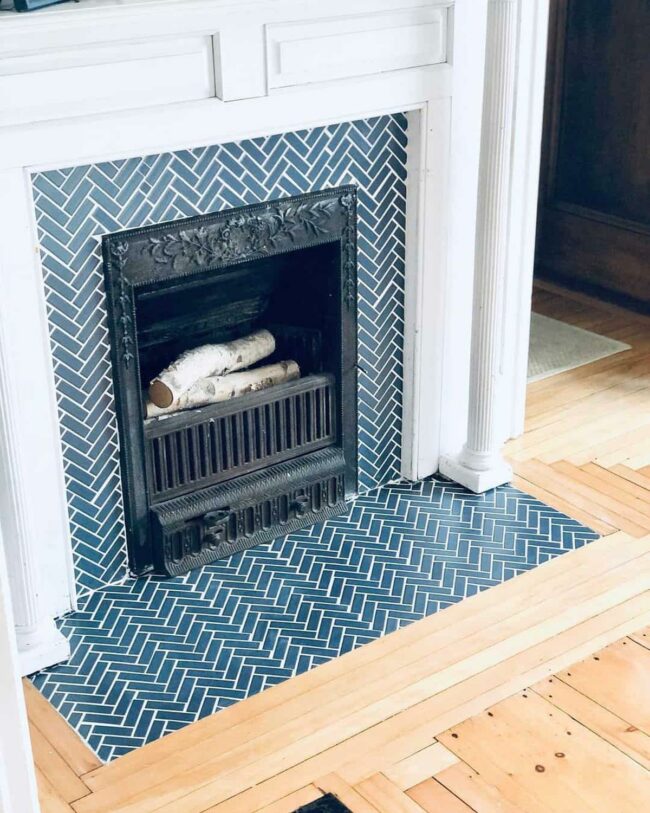 Mesmerizing blue and white herringbone tiles dominate the fireplace, instantly capturing attention with its elegant design.