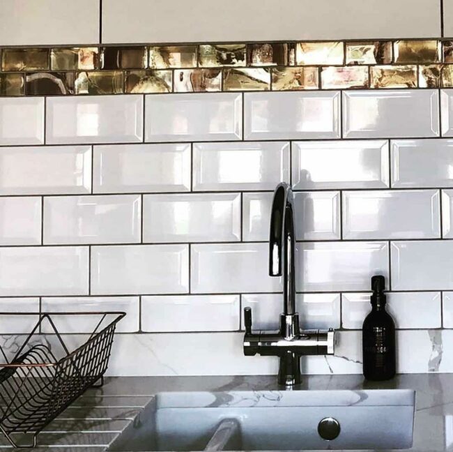 White metro tiles form a pristine canvas that complements the dramatic stone surface perfectly.