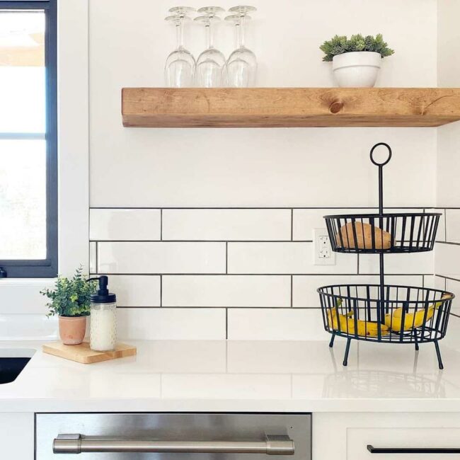 Kitchen design reaches new heights with classic white subway tiles and black grout highlighting shaker-style cabinets.