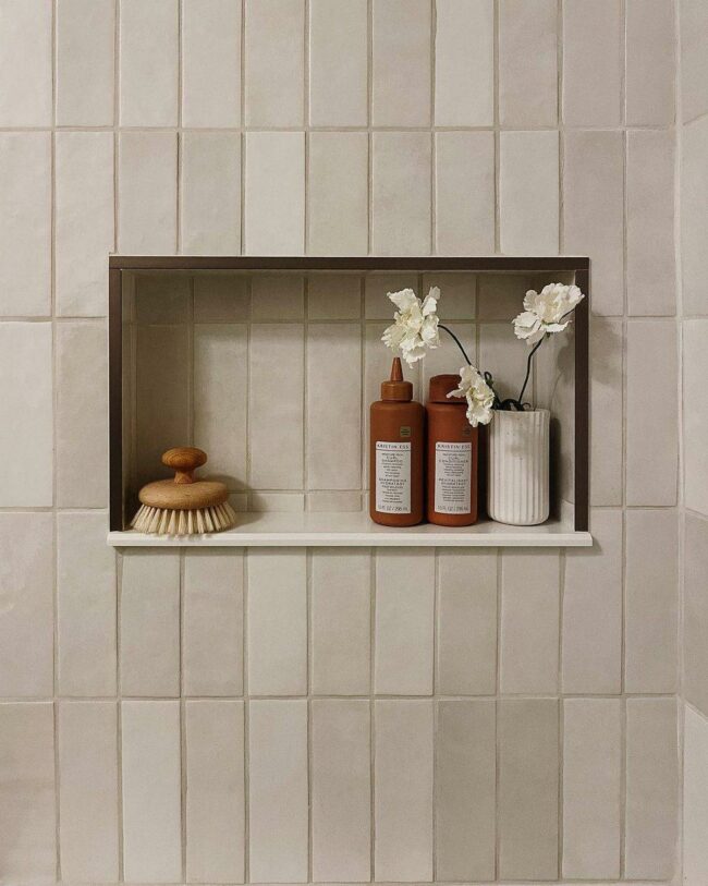 White-trimmed shower niche provides smart storage while complementing the minimalist color scheme.