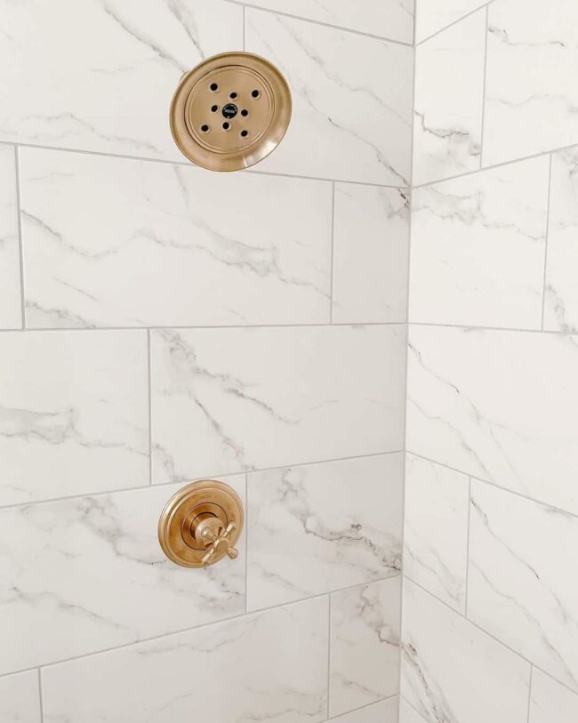 Luxurious marble tiles in white and gray dominate the shower space, creating an instant sense of tranquility.