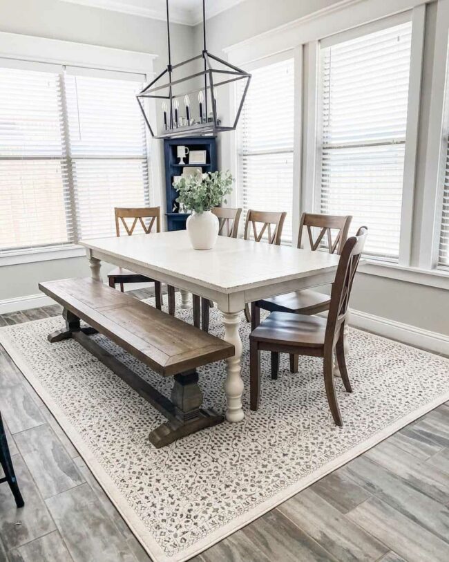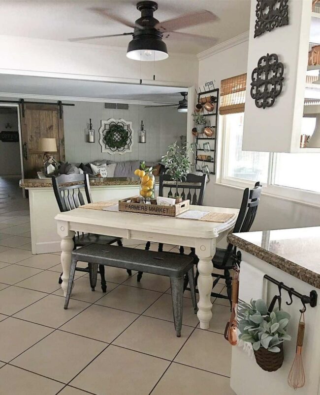 White farmhouse tables anchor this charming space with gray chairs and a matching bench that invite comfortable gatherings.