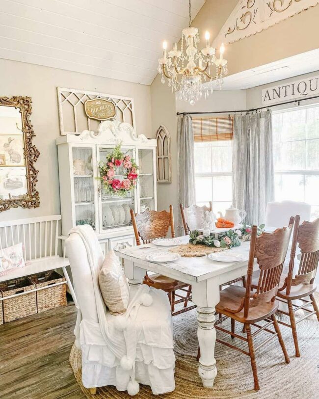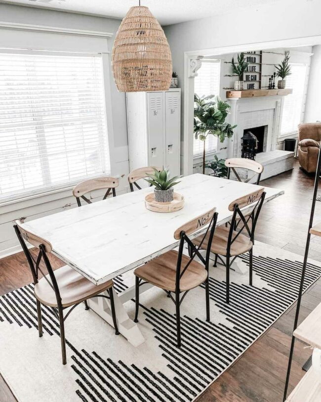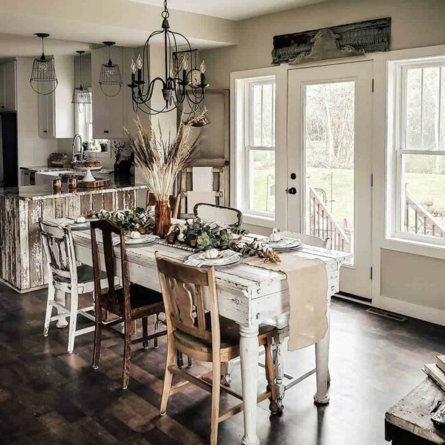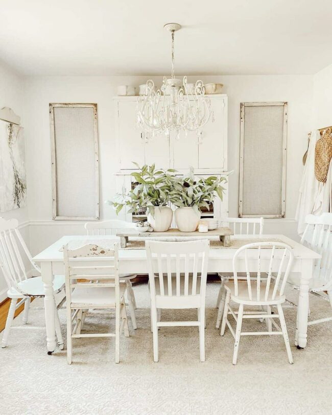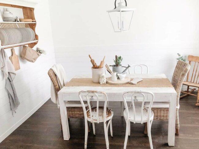 Farmhouse dining rooms shine with character, starting with a white wooden table that commands attention and defines the space's rustic elegance.
