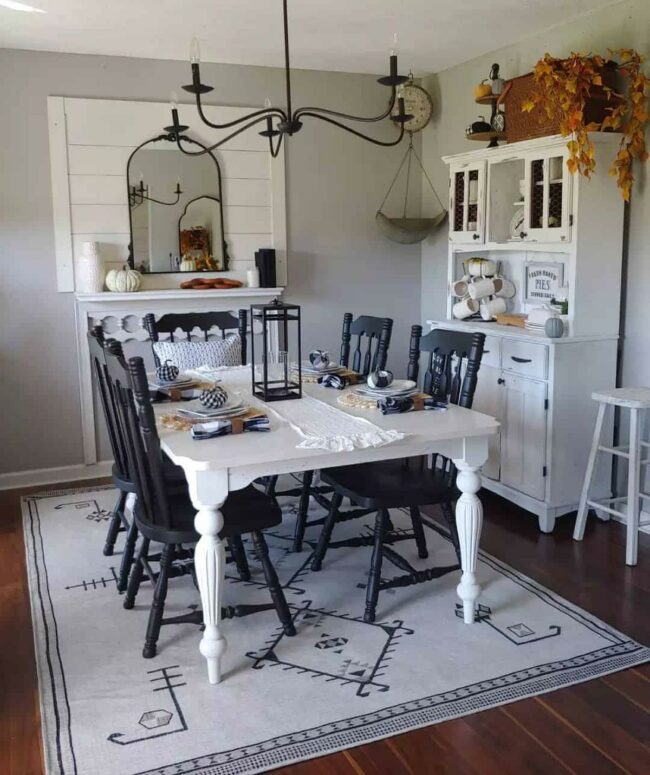 Rustic charm meets modern elegance in this dining room, where a white farmhouse table anchors the space with dark wood chairs creating bold visual contrast.