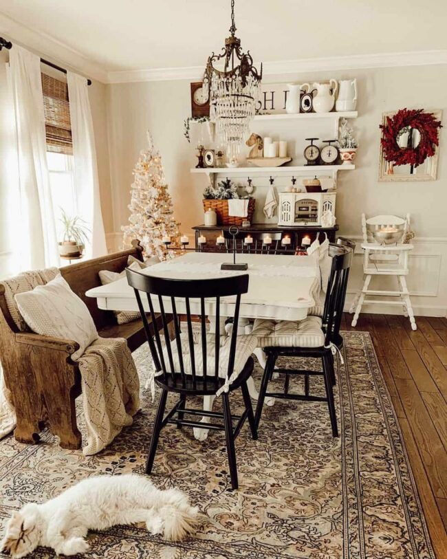Cedar-toned floors anchor this charming dining space, creating a bold backdrop for a pristine white farmhouse table that commands attention.