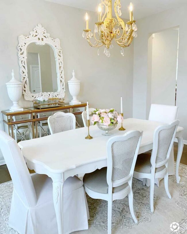 Bronze chandelier hanging above a white farmhouse table instantly elevates the dining area's elegance and warmth.