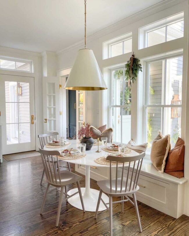 Warm morning sunlight floods a charming kitchen nook centered around a crisp white farmhouse table, instantly drawing you into its inviting embrace.
