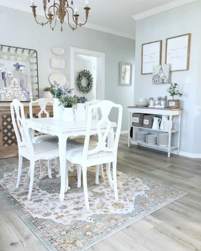 Light gray walls offer a calm, neutral canvas for a pristine white buffet hutch that adds elegant storage potential.