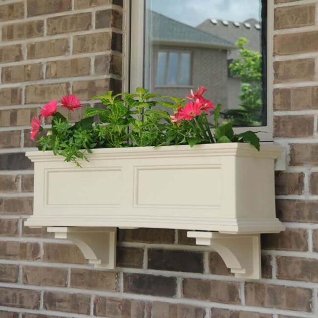 Measuring approximately 24 to 36 inches long, these containers attach securely to window frames or railings using sturdy mounting brackets.