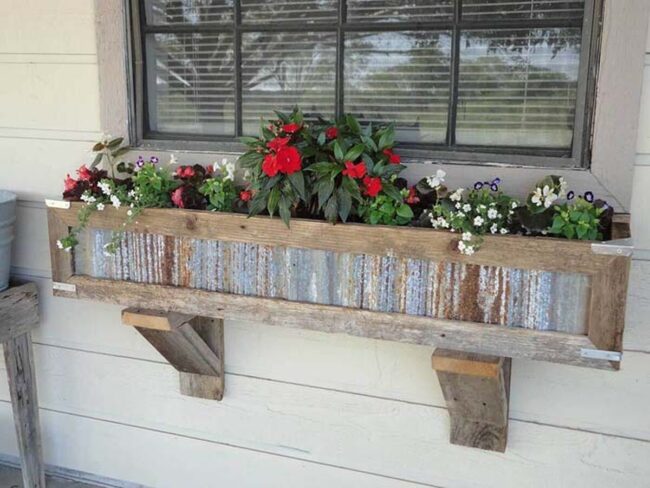 Rustic farmhouse box planters blend natural wood with galvanized tin, creating a stunning design that withstands outdoor challenges while adding character to any space.