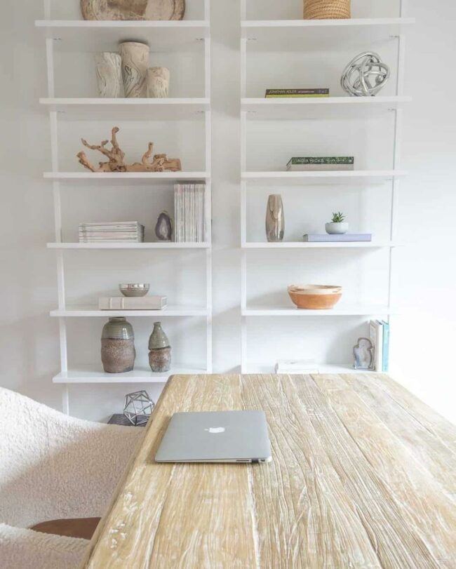White bookshelves radiate calm coastal vibes, transporting you to sunny beaches with their pristine design.