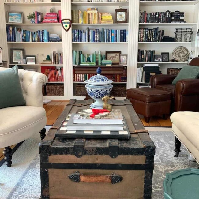 An antique trunk serves as a charming coffee table, adding vintage character to the room's design.