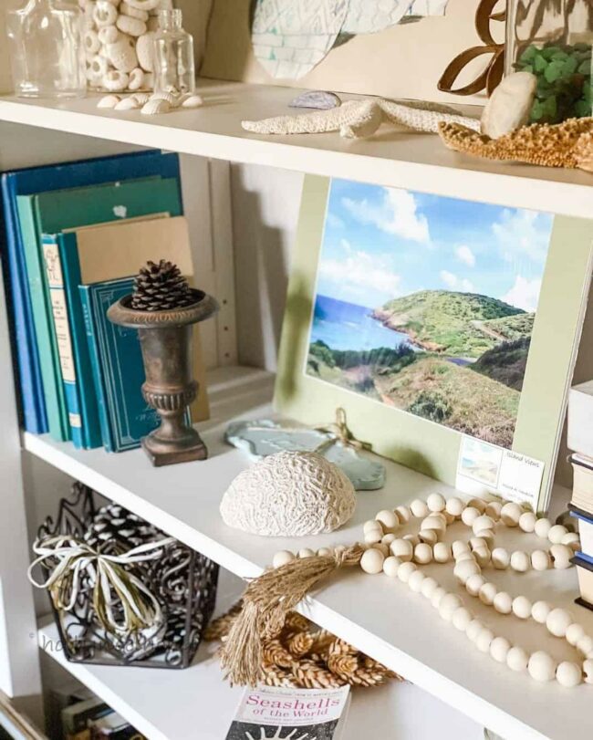 Beige coastal accessories complement the clean shelving, adding warmth and texture to the space.