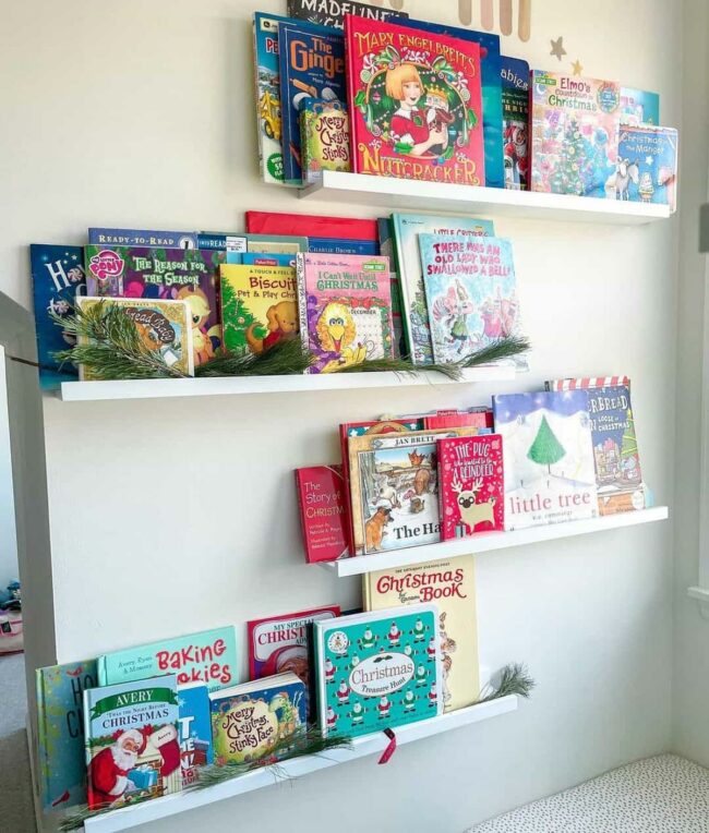 Pine decorations bring festive warmth to the shelving area, making reading corners feel special and welcoming.