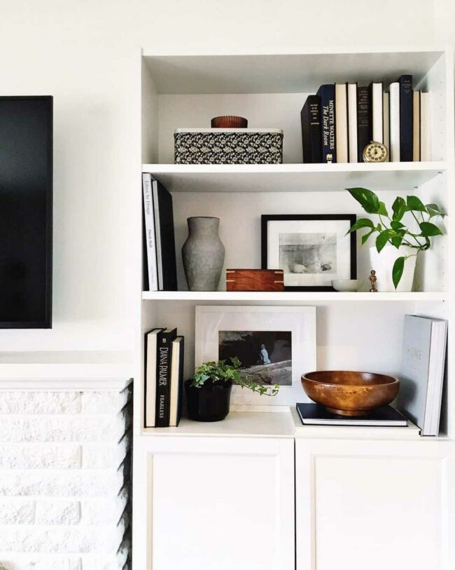 White built-in bookshelves create a stunning backdrop for carefully curated novels and treasured photographs.