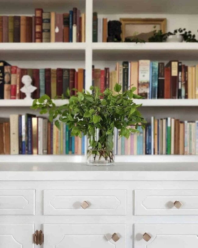 Elegant white bookcases showcase color-coordinated books that draw immediate attention and spark visual interest.