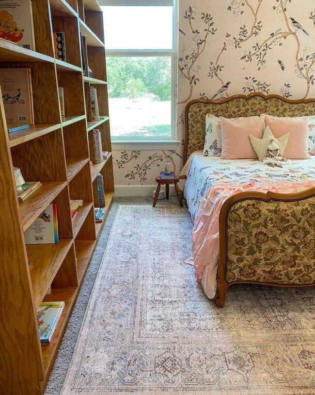 White floral wallpaper wraps the room in a peaceful embrace, creating an instant sanctuary for quiet moments and dreamy adventures.