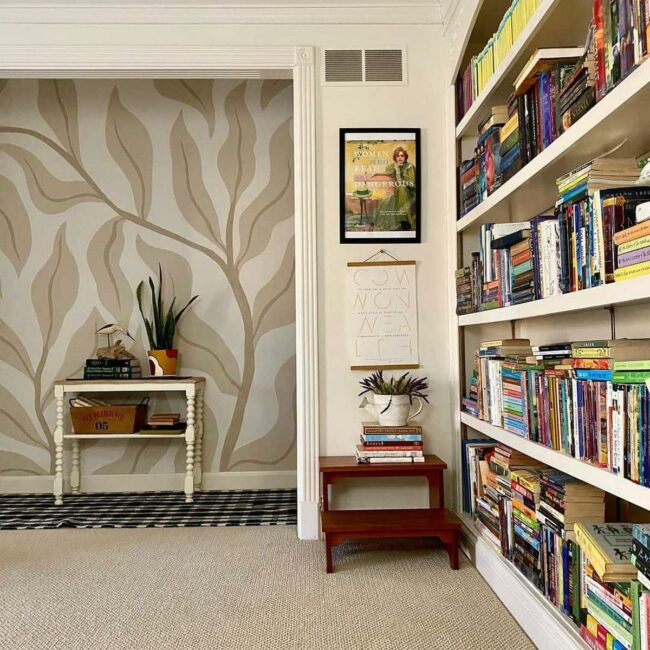 Delicate leaf print wallpaper lines the hallway, bringing sophisticated calm to the area.