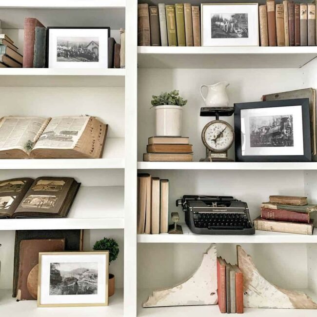 White home library shelves exude pure tranquility, showcasing antique books that whisper stories from forgotten eras.