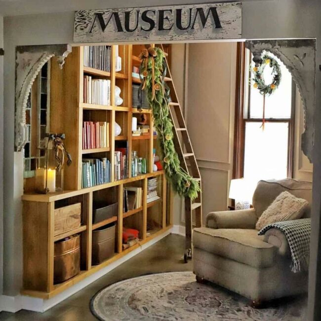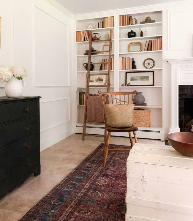 Wooden ladder shelves add unexpected charm, standing ready for literary exploration.