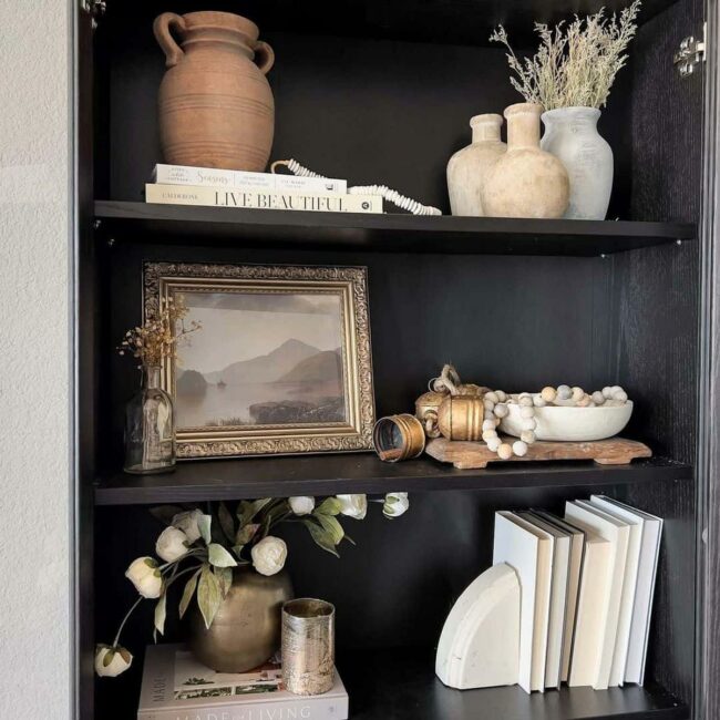 Black bookshelves radiate sophisticated charm when styled with carefully curated elements.