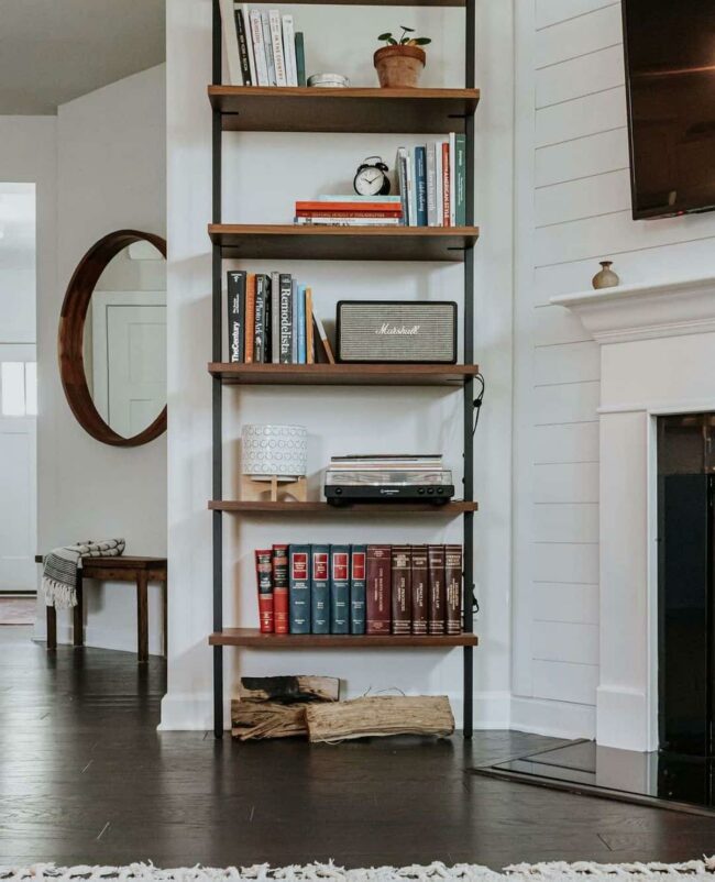 White fireplace shiplap provides a clean backdrop that highlights the bookshelf's bold design.
