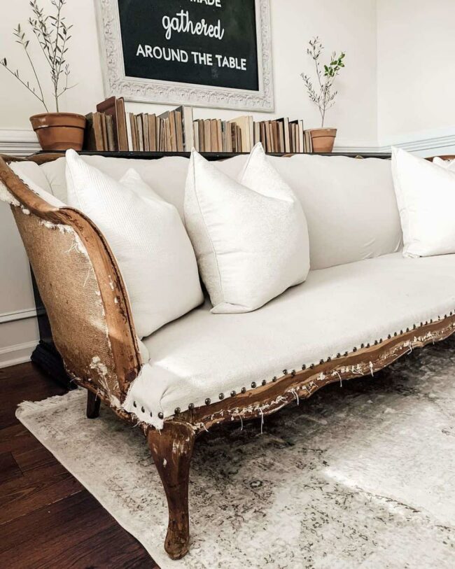 Homey vibes radiate from this carefully curated living space, where a wood and white couch beckons you to unwind on a charming gray vintage rug.