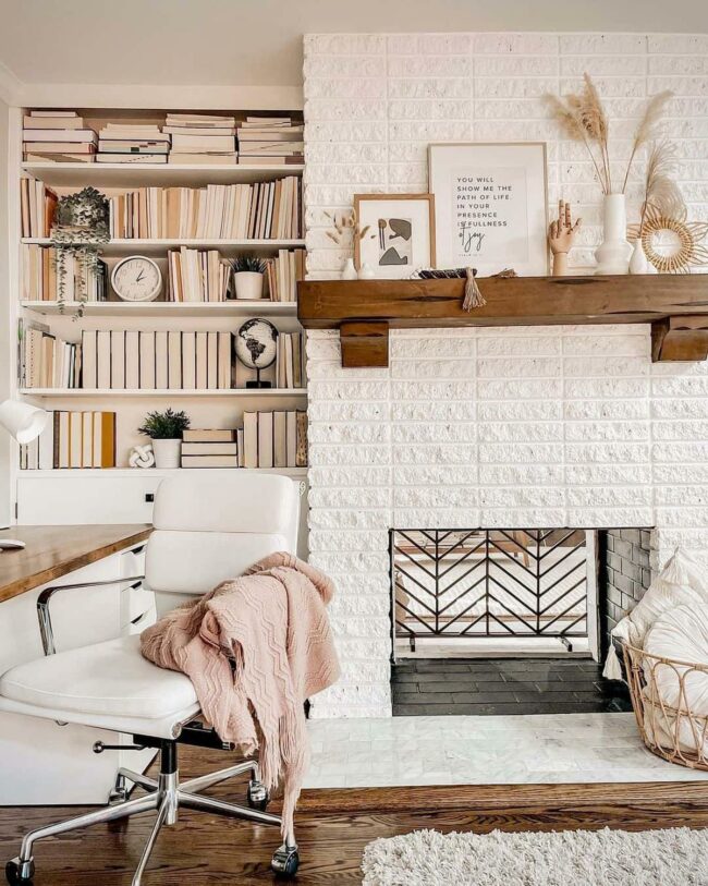 Striking white brick frames a charming fireplace with a rich wooden mantel, drawing immediate attention to the room's heart.