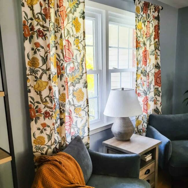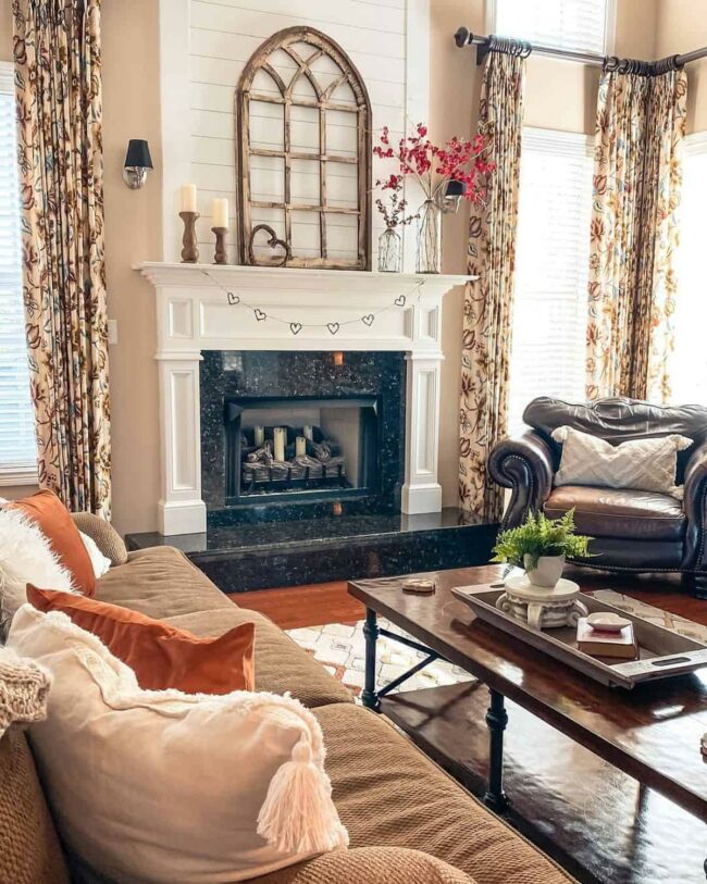 Drapes in deep oranges and russet browns frame windows with elegant simplicity, signaling fall's gentle arrival.