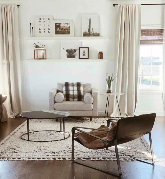 Wooden floors anchor the space, enhanced by layered neutral rugs that invite relaxation and add depth to the room.
