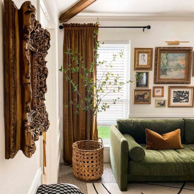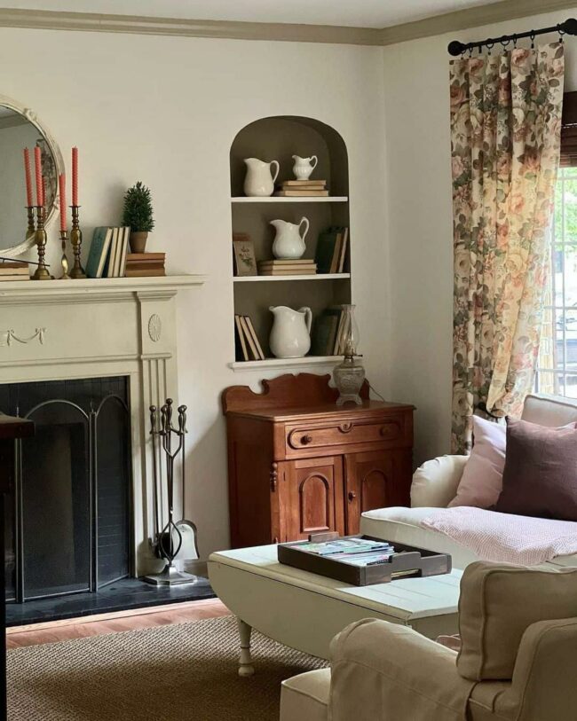 Soft natural light streams across beige curtains, highlighting carefully curated decor pieces.