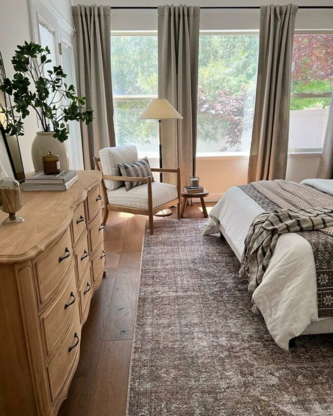 Warm wood flooring anchors this minimalist space with farmhouse charm, creating an inviting sanctuary that feels effortlessly stylish.