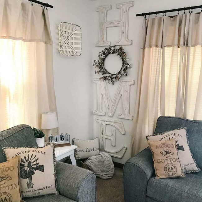 Whitewashed letters and a delicate floral wreath create visual interest on the wall, complemented by a classic white tobacco basket nearby.