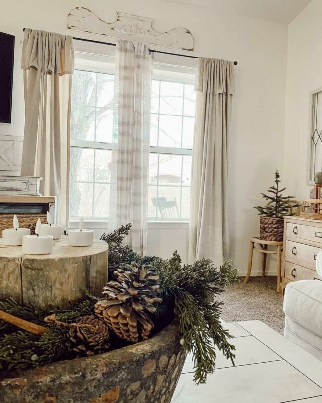 Subtle greenery like a pine tree nestled in a rustic rattan pot adds organic charm and seasonal magic.