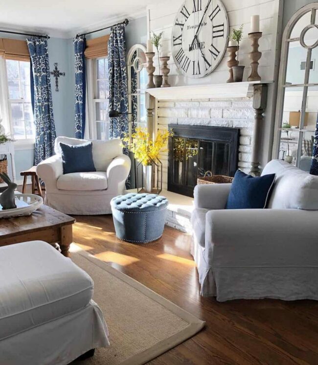 Patterned drapes elevate living room design with bold blue and white hues that spark instant visual excitement.