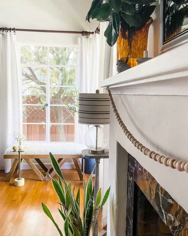 Minimalist white mantels draw eyes with their striking contrast against light wood beads and delicate greenery.