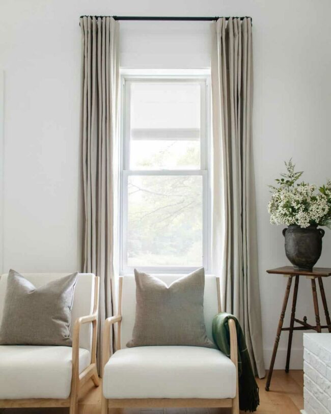 Floor-length curtains in flowing fabrics create dramatic visual height and softness.