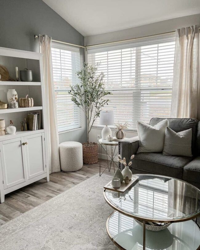 Natural wood elements blend perfectly with a neutral couch, anchoring the space with understated sophistication.