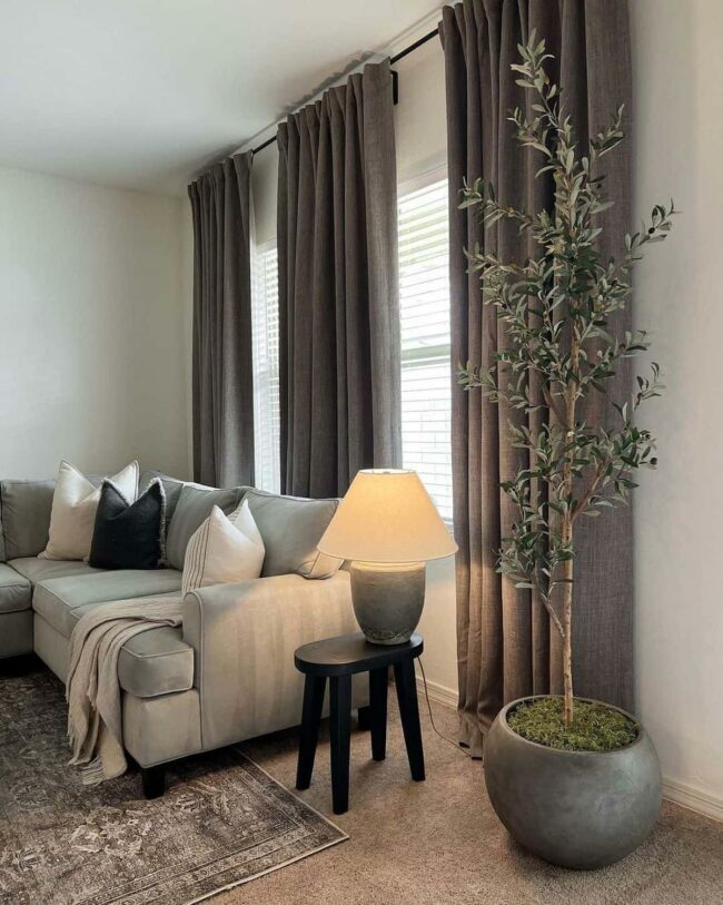 Earthy drapes frame windows, softening natural light and adding depth to your room's atmosphere.