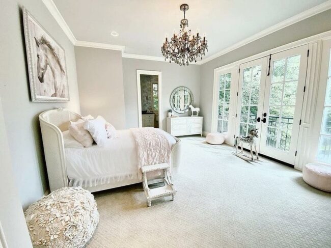 Vaulted ceilings elevate the space, drawing eyes toward a graceful gray beaded chandelier hanging delicately overhead.
