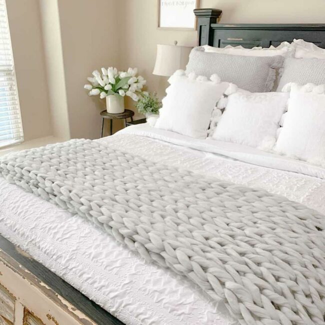 Gray knit throws elevate bedroom design with understated elegance, wrapping spaces in comfort and style.