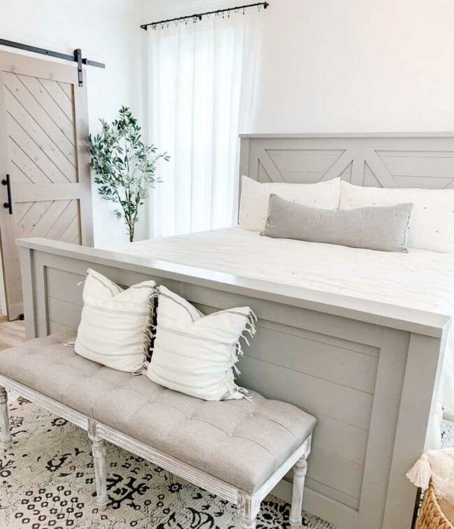 Grey bedframes with barn door designs offer an instant design upgrade for modern bedrooms, introducing unique architectural interest through carefully crafted details.