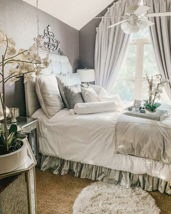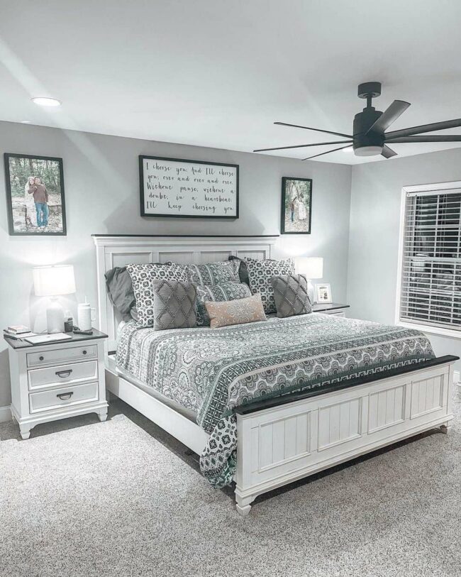 Gray king-sized bed with floral quilts commands immediate attention in this dreamy master bedroom.