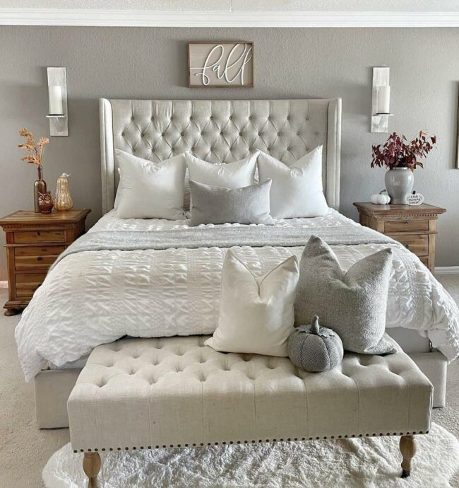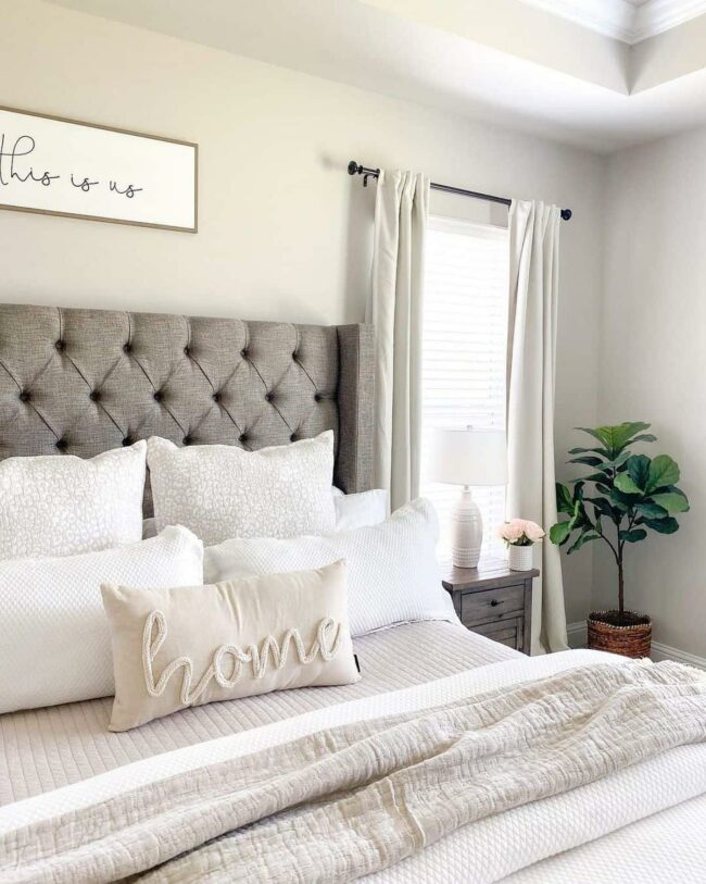 Textured furnishings like tufted headboards complement the color's understated charm perfectly.